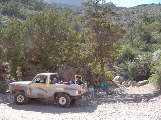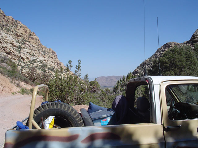 Howdy and welcome to the board. In the middle of the Redrocks Loop, there is a 4wd trail that heads into the mountains. I've been up that trail quite a ways and it does go through to Pahrump I think. It's mighty beautiful up there. You might want to check it out. You can park at the trail head or drive on up in there with a 4wd vehicle. Here are some pics of the area.